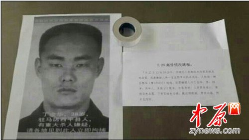 7月25日12时20分许,漯河市召陵区人民路红太阳家具城发生命案,犯罪嫌疑人将一名出租车司机杀死后,又抢劫一辆出租车(豫LT0123)逃逸,犯罪嫌疑人叫丁金华,男,38岁,驻马店西平县人,身高175厘米,中等身材,上身穿黑色背心,肩搭白色衣服,下穿军绿色马裤,戴近视镜,带有凶器。