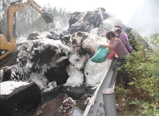 高速起火棉花遭哄抢续 司机:那是烧过不要的
