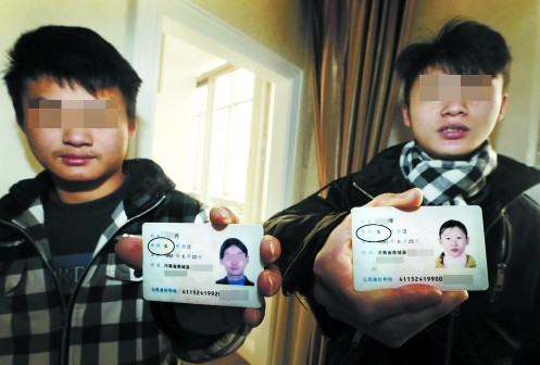 信阳网讯 现实中的兄弟俩,身份证上性别信息均为“女”.河南商城县两个年轻小伙遭遇了这样的尴尬事,不能正常乘坐火车,阔别已久的老家也不敢回。